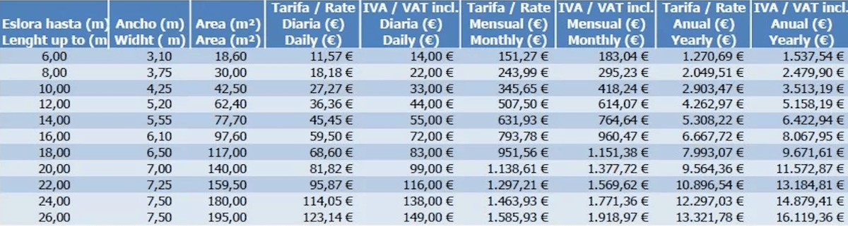- Conexiones de agua potable y energía eléctrica en todos los puntos de muelle y marina seca.